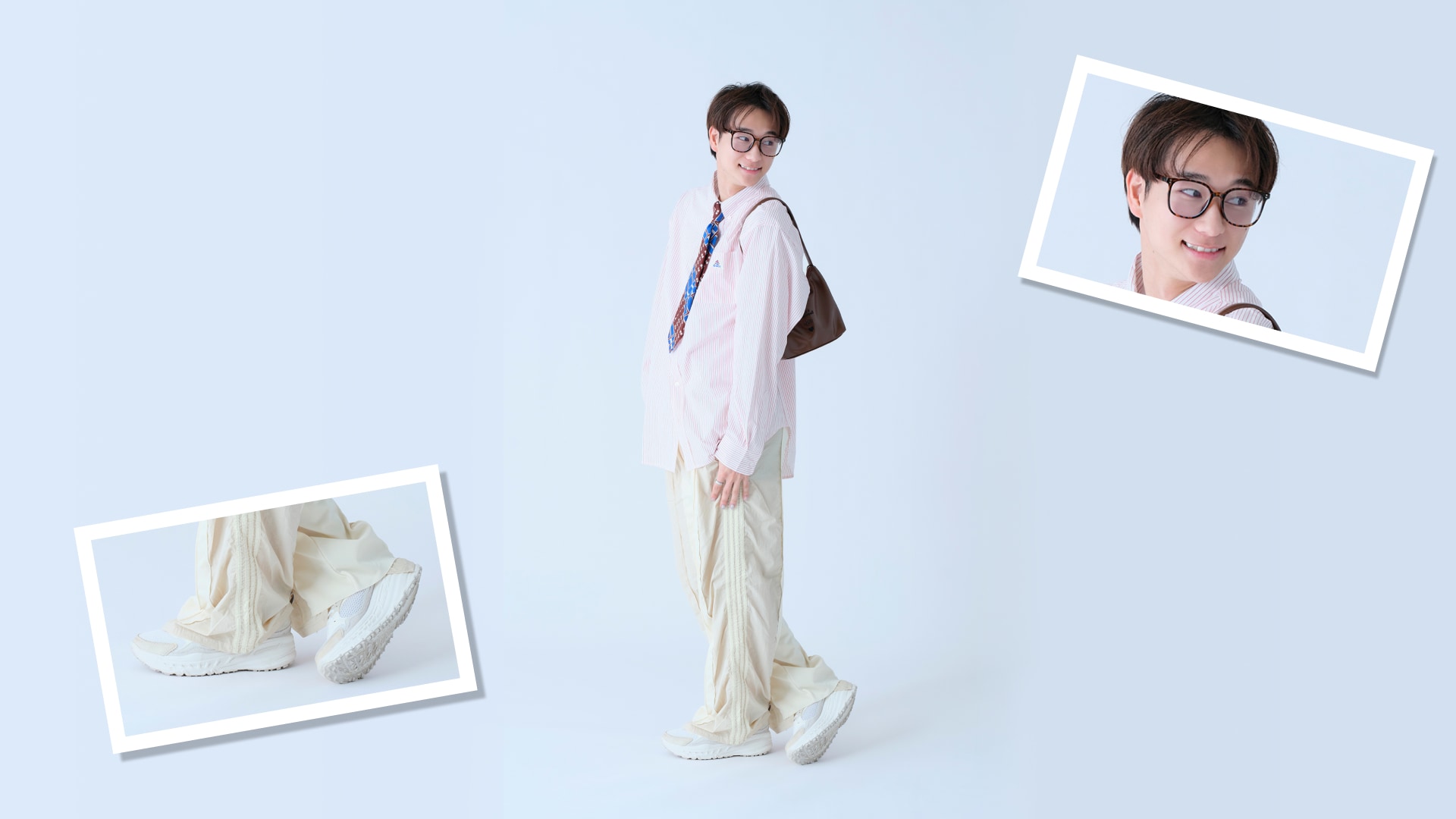 明るいカラーでまとめた爽やかなコーディネートに、おしゃれなメガネと個性のあるネクタイで遊びを取り入れることで、まとまりのある印象に。