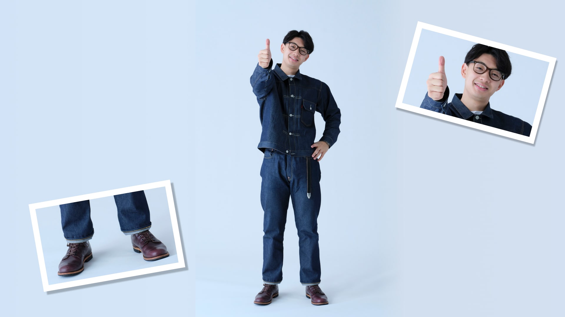 トップスからボトムスまで、デニム素材でまとめた上級者コーデ。同系トーンのベルト、靴、メガネを合わせて統一感を演出。ポケットからさりげなく覗く赤いハンカチが、遊び心あるアクセントに。